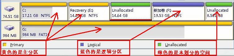 如下圖所示,黃色的是主分區(qū),藍(lán)色的是邏輯分區(qū),綠色的是未劃分的空間