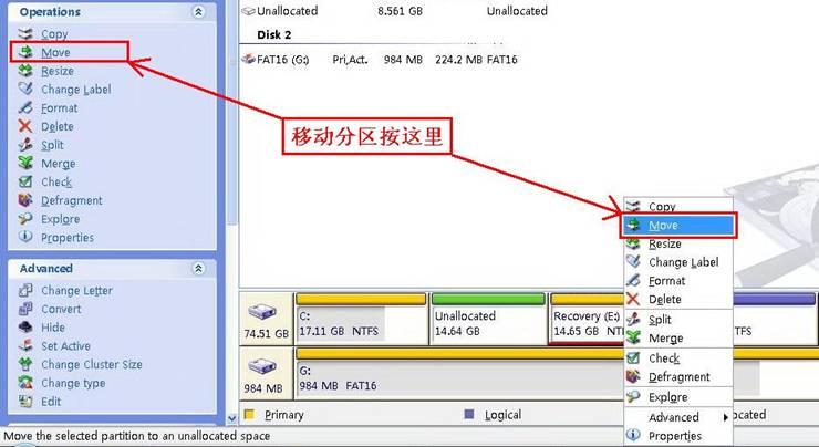 Move:移動;將選擇的分區(qū)中可用空間移動成未分配,需要未分配空間足夠大小支持(貌似是這樣,我研究了好半天呢,反正有下面的Resize工具,這個就用不著了)