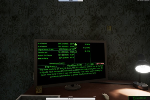 《化學家(The Chemist)》是一款由tensixfour Creative制作tensixfour Digital發(fā)行的模擬類游戲。游戲中玩家需要扮演一名化學家,并發(fā)現(xiàn)化學的陰暗面。努力工作,管理好你的資源和對生活與工作做出正確的決定同樣重要。充分利用合同和資源,你會發(fā)現(xiàn)自己在制作各種不同液體的食譜,并找到你的問題的答案。當你越來越出名的時候,一些有宏偉計劃的公司可能會開始關注你的腳步——如果你選擇和他們打交道,你就會見證你的行動的結(jié)果。【配置要求】