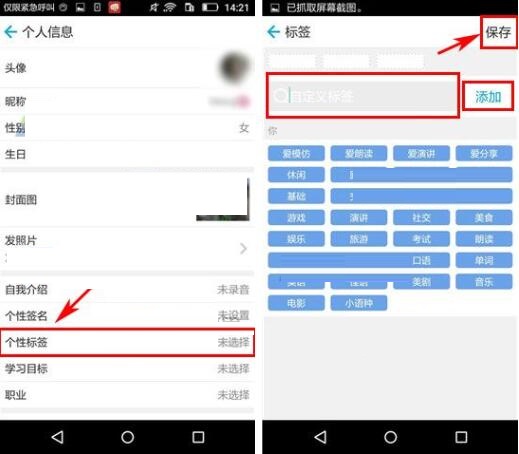 2)點擊下方的【個性標簽】,然后點擊下凡的編輯框輸入標簽,接著點擊旁邊的【添加】,最后點擊右上角的【保存】即可。(如下圖)