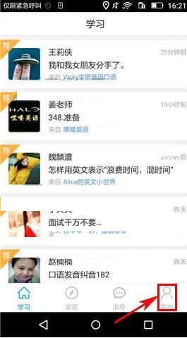 1、打開掌中英語,進入主頁面選擇【你想收聽的人】,進入她的動態(tài)后點擊右上角的【頭像】。(如下圖)