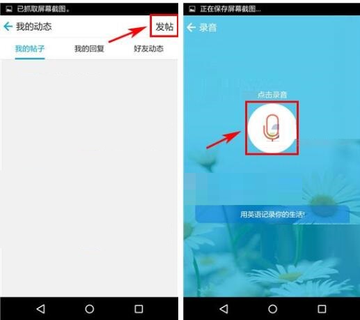 2)點擊右上角的【發(fā)帖】,然后點擊下方的【按鈕】開始錄制錄音;(如下圖)