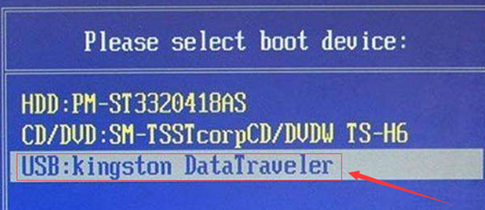 將剛制作好的U盤(pán)插在電腦的USB接口,開(kāi)機(jī)并不斷按下啟動(dòng)U盤(pán)快捷鍵直到出現(xiàn)下圖所示的窗口為止,不同的電腦主板出現(xiàn)的情況都不一致。