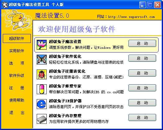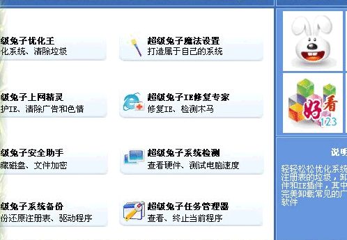 超級兔子是一個完整的系統(tǒng)維護工具,可能清理你大多數(shù)的文件、注冊表里面的垃圾,同時還有強力的軟件卸載功能,專業(yè)的卸載可以清理一個軟件在電腦內的所有記錄。 超級兔子共有8大組件,可以優(yōu)化、設置系統(tǒng)大多數(shù)的選項,打造一個屬于自己的Windows。超級兔子上網(wǎng)精靈具有IE修復、IE保護、惡意程序檢測及清除工能,還能防止其它人瀏覽網(wǎng)站,阻擋色情網(wǎng)站,以及端口的過濾。