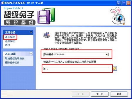 2、打開“超級兔子系統(tǒng)備份”窗口,在左窗格中單擊“系統(tǒng)備份”欄目中的“系統(tǒng)備份”選項。然后在右窗格中輸入備份文件名稱,并指定備份文件的保存位置。完成設置后單擊“下一步”按鈕