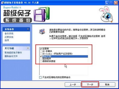 3、在打開的選擇備份內容窗口中,用戶可以根據(jù)需要選擇要備份的內容。本例選中“注冊表”和“我的文檔”復選框,并單擊“下一步”按鈕