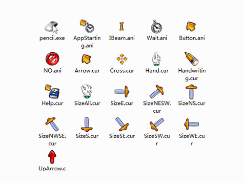 pencil鼠標指針是包含21個基本指針的鼠標指針文件,黃色圖標個性鮮明,時尚感強,圖形都是采用實圖案,十分精致,可用于搭配多種主題