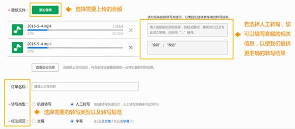 2.在上傳音頻頁面中添加需要轉(zhuǎn)寫的音頻文件,同時填寫需要的轉(zhuǎn)寫的類型以及轉(zhuǎn)寫規(guī)范等,填寫完這些信息,點(diǎn)擊“創(chuàng)建訂單”;