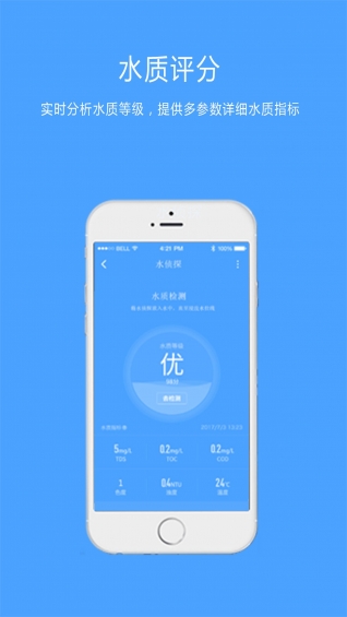 ①水質(zhì)檢測:配合水偵探多光譜水質(zhì)檢測器提供水質(zhì)等級(jí)評(píng)分評(píng)判,水質(zhì)檢測各項(xiàng)指標(biāo)詳情②水質(zhì)地圖:周邊水質(zhì)情況查看以及上傳數(shù)據(jù)