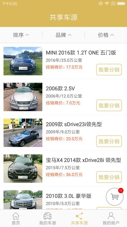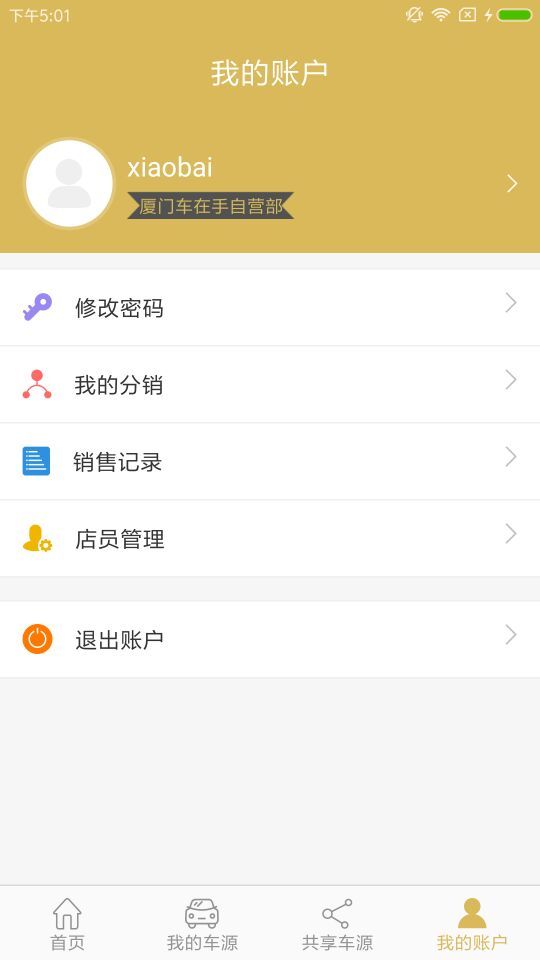 當(dāng)前版本有我的車源,共享車源,我的分銷,店員管理等模塊