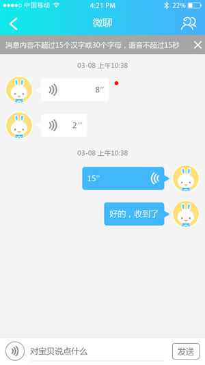 手表和app之間可以相互發(fā)送語音信息,實現(xiàn)孩子與家長之間一種新的溝通方式。除此之外,app端還可以發(fā)送微聊文本給手表,微聊溝通多樣化。