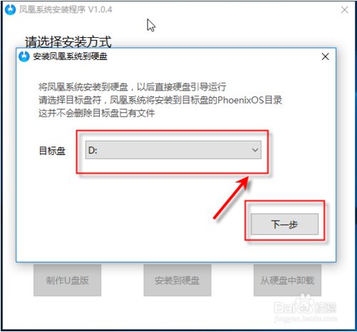 2、點(diǎn)擊安裝到硬盤后,彈出對(duì)話框,在目標(biāo)盤框框中,點(diǎn)擊一下,選擇要安裝的盤符。然后點(diǎn)擊下一步。