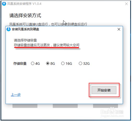 3、然后點(diǎn)擊選擇容量大小,點(diǎn)擊開始安裝。選擇的這個(gè)大小將作為這個(gè)系統(tǒng)的使用空間。選定后將不能再改了。如果硬盤大的話可以選擇大點(diǎn)的。