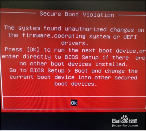 7、重啟如果現(xiàn)在下圖這個(gè)提示:the system found unauthorized changes on the firmware,operating system or uefi drivers.發(fā)現(xiàn)未經(jīng)授權(quán)的更改系統(tǒng)的固件,操作系統(tǒng)或UEFI驅(qū)動(dòng)程序,只要在BIOS中將secure boot設(shè)置為關(guān)閉(Disabled)。
