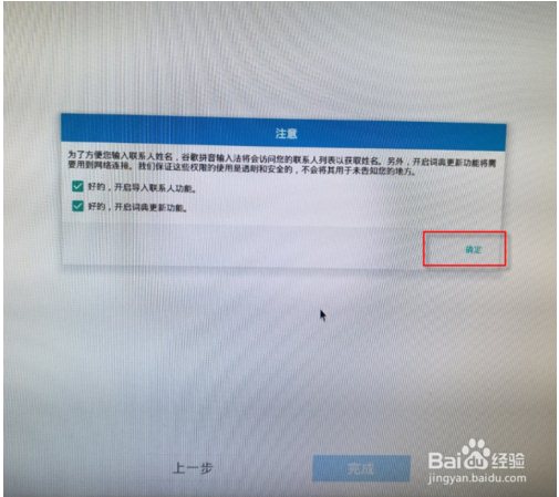 12、又出來一個(gè)提示框,輸入法需要用到聯(lián)系人。不管他,點(diǎn)擊“確定”即可。