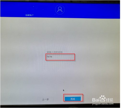 13、接下來就到了創(chuàng)建用戶界面。請(qǐng)輸入您的名字,在下面輸入一個(gè)名字,然后點(diǎn)擊底下的“完成”。