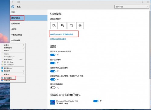 右鍵后選擇“顯示設(shè)置”--選擇“通知和操作”--最后點(diǎn)擊“選擇在任務(wù)欄上顯示哪些圖標(biāo)”