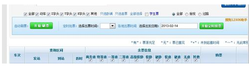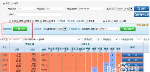 輸入自己的起始站點,和乘車日期,然后點擊自動刷票,就會彈出當前的可購買車票。這樣您就可以選擇購買自己的火車票。在有票的情況下,自動刷票和查詢功能基本一樣,沒啥區(qū)別的。如果現(xiàn)在沒有火車票的話,那么我們當然還是要看它的定時搶票功能了。