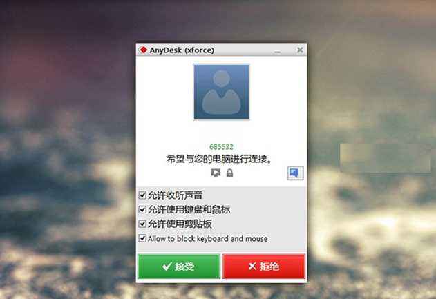 而在「其他工作臺」一欄中,輸入別人的 AnyDesk 地址并點擊連接按鈕,即可向?qū)Ψ诫娔X發(fā)出控制的請求,待被控電腦點擊「接受」之后 (如下圖),即可開始遠程控制對方桌面。
