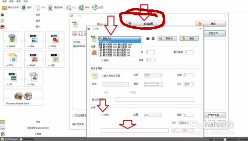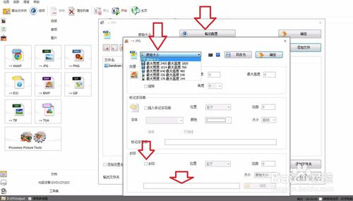 添加圖片后,再打開正上方的【輸出配置】,進(jìn)來后再根據(jù)圖片指示那樣設(shè)置圖片大小,也可以給圖片添加水印上去,如圖。