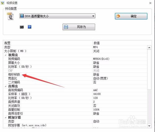 這時會打開應(yīng)用的“視頻設(shè)置”窗口,在下面的配置列表中找到“每秒楨數(shù)”一項
