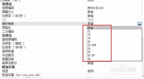 默認(rèn)其數(shù)值為缺省,我們點擊每秒楨數(shù)下拉菜單,在下拉菜單中我們選擇一個每秒的楨數(shù),如果選擇的楨數(shù)比原視頻的數(shù)值大,就會加快其播放速度,如果楨數(shù)比原來的視頻數(shù)值小,就會減慢其播放速度