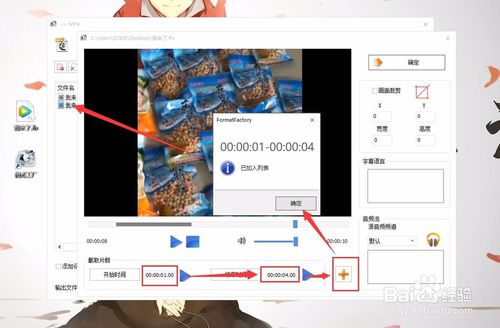 那么我們就可以對視頻進(jìn)行剪輯了,我們先過一遍視頻,看看視頻中那些部分是我們需要剪輯截取的,然后記住這部分的開始和結(jié)束時間,然后我們在下方截取片斷中可以手動輸入開始和結(jié)束時間,然后點擊后面的加號就可以將截取的視頻保存到前面的文件列表中了。