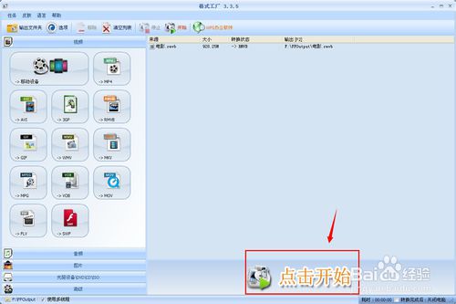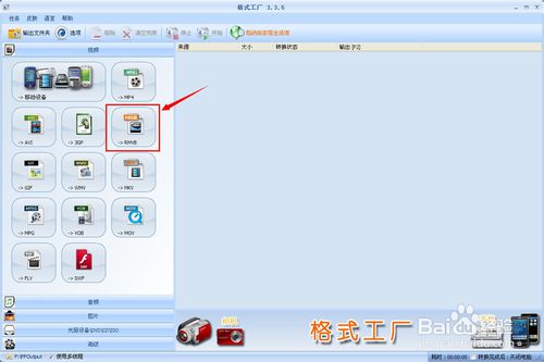 打開格式工廠軟件,因為原視頻文件是RMVB格式的,這是我并不想轉(zhuǎn)格式,所以單擊[->RMVB],如果想同時轉(zhuǎn)換為其它格式可以單擊相應(yīng)的按鈕