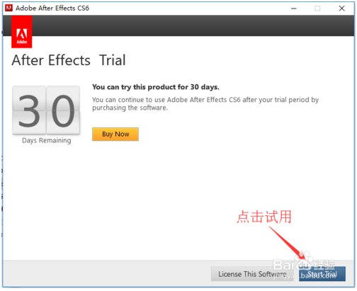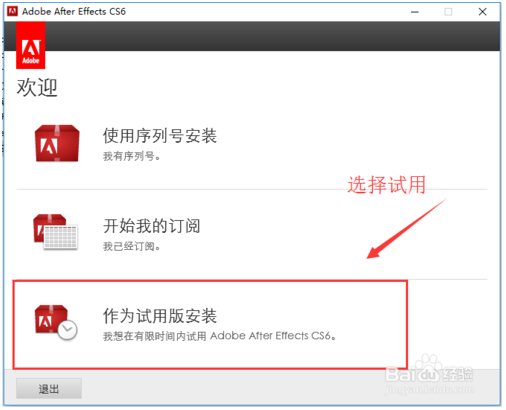 第三步:Adobe After Effects cs6【AE CS6】安裝界面,選擇試用版本進(jìn)行安裝。