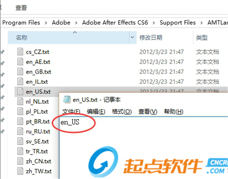 4、相反如果我們要切換到英文,我們要在Adobe After Effects CC/Support Files/AMTLanguages路徑下,新建 en_US.txt 的文本文檔(文本內(nèi)容是:en_US)。