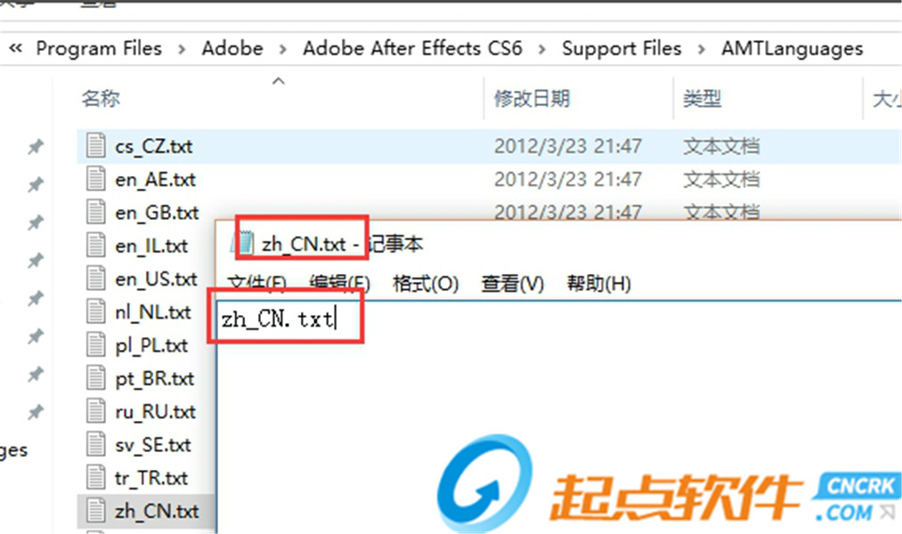 3、所以,如果我們要切換到中文,我們要在Adobe After Effects CC/Support Files/AMTLanguages路徑下,新建 zh_CN.txt 的文本文檔(文本內(nèi)容是:zh_CN);