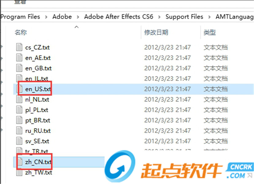 5、當(dāng)然要注意,zh_CN.txt 和 en_US.txt不可以同時(shí)存在,否則AE CC啟動(dòng)會(huì)出問(wèn)題的,或者是軟件界面語(yǔ)言根本不變!所以我們要留一個(gè)刪一個(gè)。