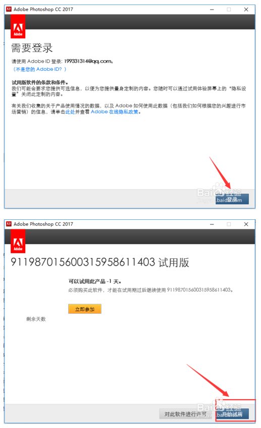 Creatice Cloud安裝程序安裝好軟件之后,會自動啟動軟件,在啟動軟件的時候需要進行軟件的ID賬號登錄。登錄之后進行開始試用,打開軟件。