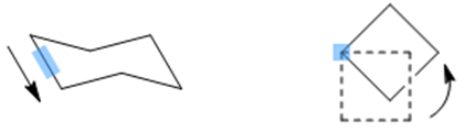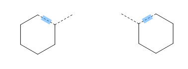當(dāng)用模板作圖時(shí),第一個(gè)被繪制的鍵(下面左圖中藍(lán)色陰影處)決定了模板在繪制窗口的位置,所有剩余的鍵都將以逆時(shí)針?lè)较蚪?。模板最左邊頂端的原子(下面右圖中藍(lán)色陰影處)會(huì)首先被建立,按住鼠標(biāo)圍繞該原子畫圓拖動(dòng)可以調(diào)整模板在繪制窗口的位置。