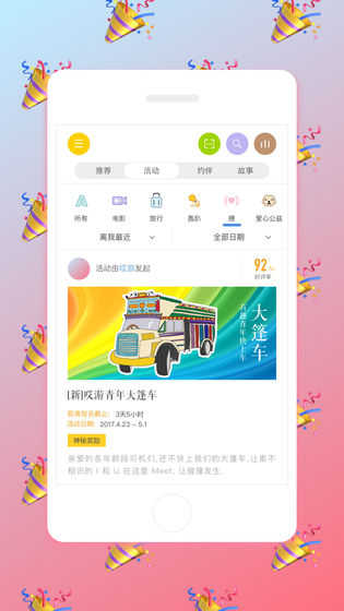 --發(fā)現(xiàn)身邊感興趣的活動。通過興趣和位置來篩選,海量免費及福利活動等你加入,總有幾款讓你心動。