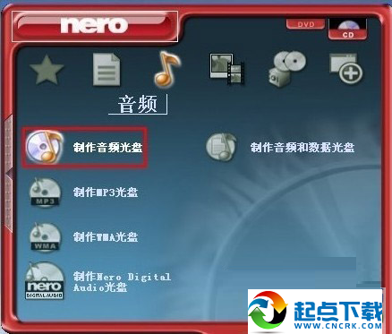 2、由于有些人刻錄的東西都不一樣,在這里我就不一一詳解了,就用制作MP3光盤(pán)來(lái)當(dāng)作例子,其實(shí)操作很簡(jiǎn)單,所以我想基本上每個(gè)人都看得懂。鼠標(biāo)移動(dòng)第三個(gè)【音 頻】那里,然后再點(diǎn)下面紅框的制作音頻光盤(pán)。