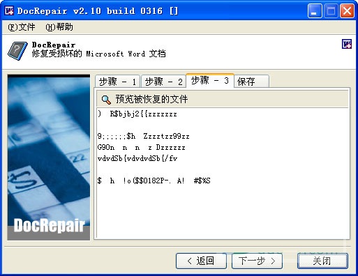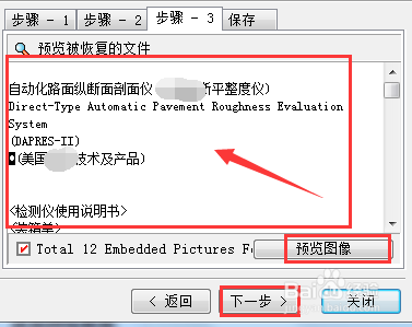 這樣就進(jìn)入“恢復(fù)文檔預(yù)覽”界面,箭頭所指為文檔文字內(nèi)容,點(diǎn)擊“預(yù)覽圖像”按鈕,如果文檔本來有圖片,可以看到可以恢復(fù)的圖像,預(yù)覽完畢,點(diǎn)擊“下一步”,進(jìn)入文檔保存界面。