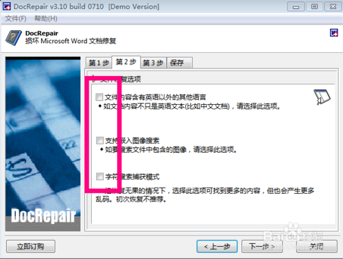接著進(jìn)入“恢復(fù)選項(xiàng)”界面,前兩項(xiàng)建議全部勾選,這樣可以保證文件中有除英文以外的語言和有圖片時(shí),可以正?;謴?fù)文字和圖片,第三項(xiàng)不必勾選,如果勾選前兩項(xiàng)后,文檔未正?;謴?fù),可以勾選該選項(xiàng)。勾選完畢,點(diǎn)擊“下一步”。