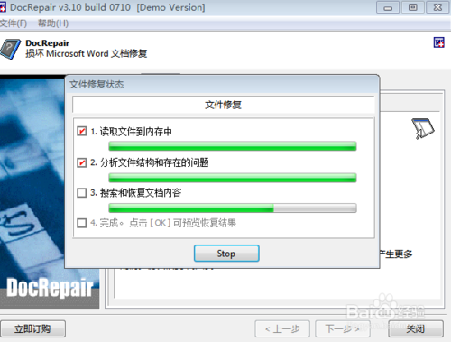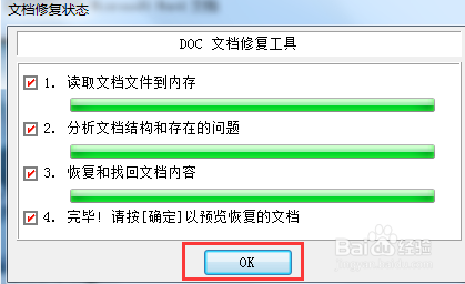 然后進(jìn)入“文檔修復(fù)”界面,軟件會(huì)執(zhí)行一系列操作,包括讀取、分析等,會(huì)有進(jìn)度條提示,當(dāng)所有進(jìn)度都完成后,點(diǎn)擊“OK”按鈕,進(jìn)行恢復(fù)文件預(yù)覽。