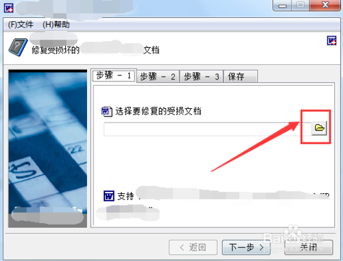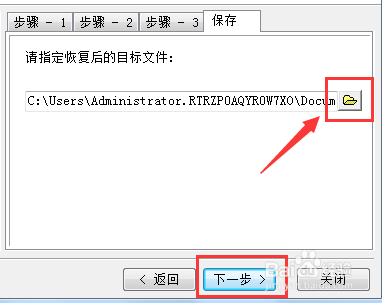 在“文檔保存”界面,點(diǎn)擊箭頭所指按鈕,會(huì)彈出路徑選擇窗口,選擇文檔儲(chǔ)存位置后,點(diǎn)擊“下一步”保存修復(fù)的文檔和圖片。