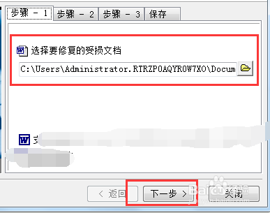 此時(shí),待修復(fù)的文件選擇完成,其路徑出現(xiàn)在軟件窗口,點(diǎn)擊“下一步”進(jìn)入下一步操作。