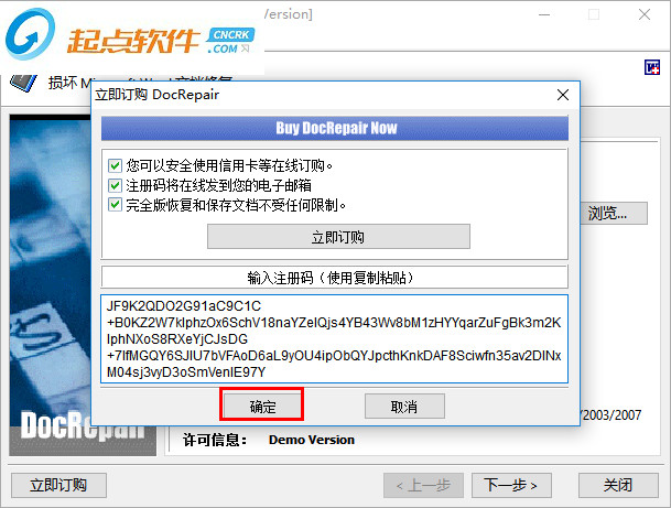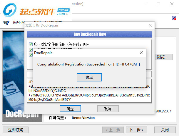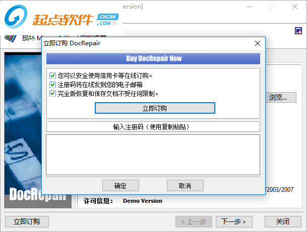 隨即,彈出了如下所示的立即訂閱docrepair的窗口,我們?cè)谳斎胱?cè)碼一欄下復(fù)制以下提供的注冊(cè)碼到注冊(cè)碼填寫窗口。