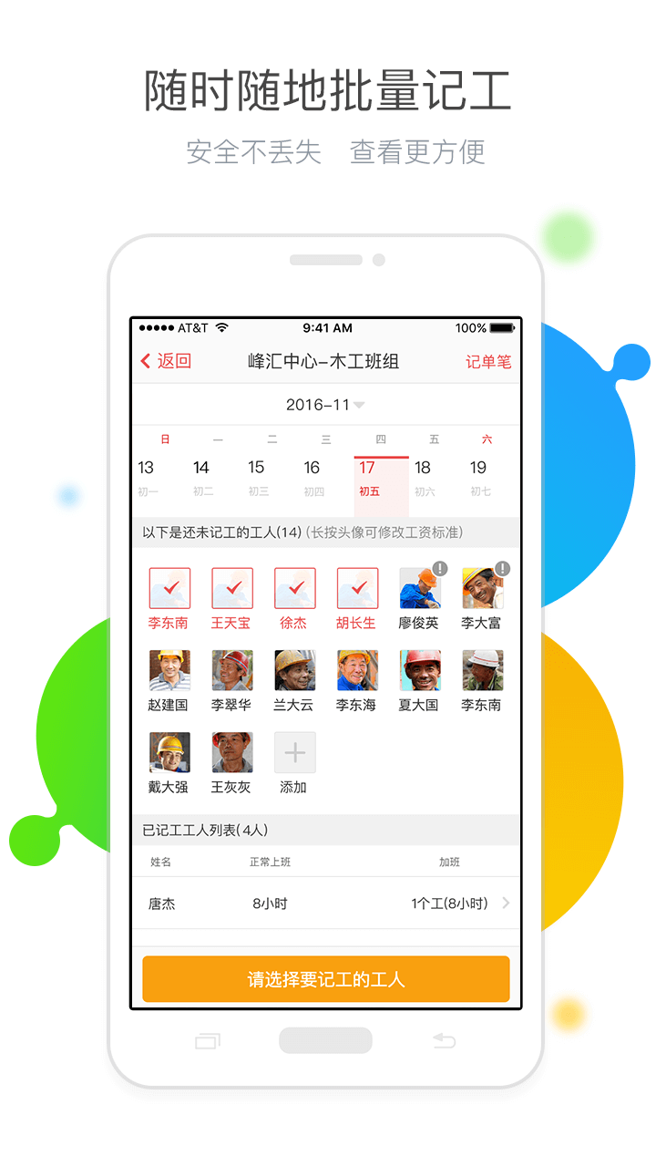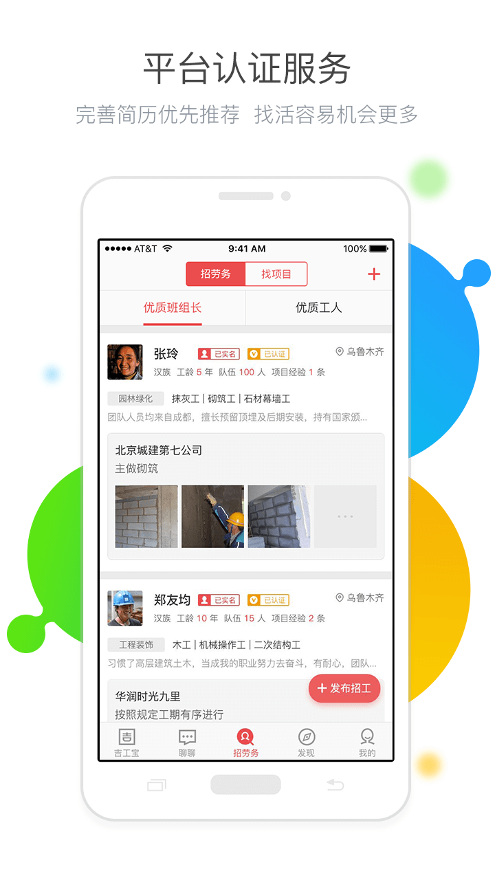 1、海量工作輕松找、優(yōu)質(zhì)工人快速招;2、手機(jī)隨時(shí)記工天、賬目明細(xì)很清楚;