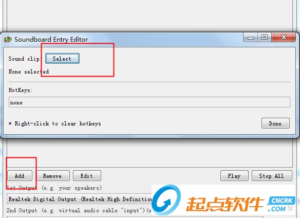 2、然后點擊ADD,添加自己的語音包,然后在鼠標(biāo)左鍵單擊HotKeyS中設(shè)置你要播放音效的快捷鍵,鼠標(biāo)右鍵清除,設(shè)置好后點擊Done即可添加