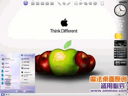 魔法桌面原創(chuàng)xp仿vista桌面主題——思而不同。主題用炫彩的蘋果圖片做開始菜單,配合亮灰色的任務(wù)欄,為你帶來細膩且具有磨砂效果的質(zhì)感主題。主題包含三種字體版本,默認是宋體版,您可以在“外觀”-“字體大小”處切換至微軟雅黑版或是arial字體版。此主題還附帶精美的思而不同仿mac登陸界面哦