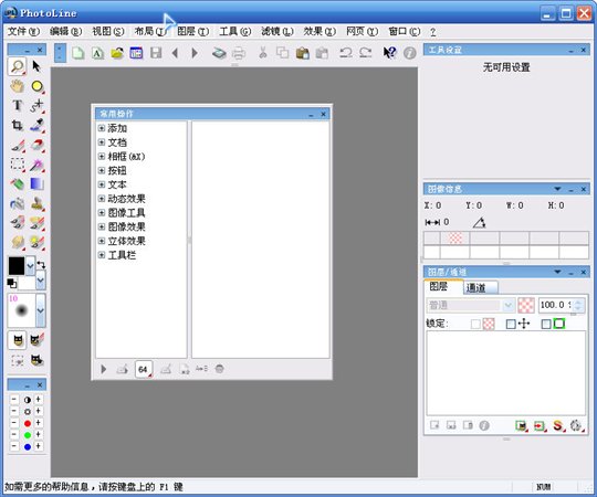 PhotoLine 支持單頁(yè)圖片或多頁(yè)文檔,支持常見(jiàn)的圖形圖像文件格式,psd、pdf 也支持的不錯(cuò);支持像素、矢量或文字圖層及編組;PhotoLine 包含各種專(zhuān)業(yè)繪畫(huà)、調(diào)整、輔助和歷史記錄工具,內(nèi)置畫(huà)筆、圖案、效果和濾鏡很豐富;支持模板、日歷,自帶圖片瀏覽器、幻燈功能和圖像格式批量轉(zhuǎn)換;PhotoLine 的文字排版工具強(qiáng)大,支持圖文繞排、自動(dòng)頁(yè)碼、路徑文字、多塊多頁(yè)文字連續(xù)排版,標(biāo)尺控制段落縮進(jìn);支持切片、按鈕設(shè)計(jì)器和 gif 動(dòng)畫(huà)等網(wǎng)頁(yè)設(shè)計(jì)功能,甚至能輸出 swf 格式的 flash。