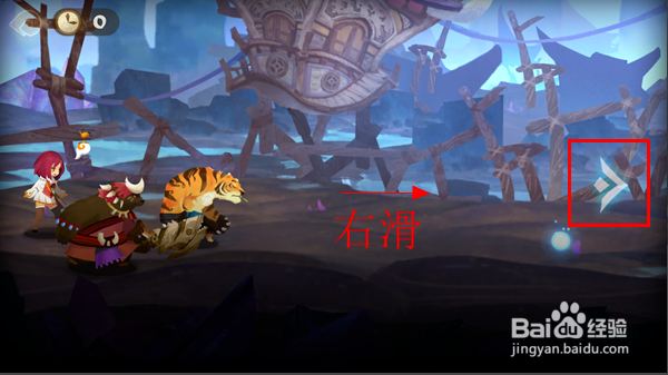 第四步,進(jìn)入頁(yè)面后如果右側(cè)出現(xiàn)箭頭,則表明需要移動(dòng)游戲人物,手指在屏幕上向右滑動(dòng)即可使人物移動(dòng),如下圖所示: