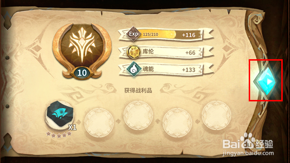 第七步,完成該關(guān)卡游戲后會(huì)呈現(xiàn)出戰(zhàn)利品,以及相應(yīng)屬性的增加,點(diǎn)擊藍(lán)色寶石圖標(biāo)即可回到游戲主頁(yè),如下圖所示: