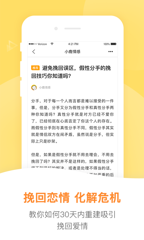 小鹿情感:全程護(hù)航835萬用戶的戀愛征途,讓愛得償所愿!超過800萬男孩使用,幫助男生解決如何追女孩、找到女朋友、挽救破裂的婚姻、愛情,以及如何跟女孩聊天、約會戀愛、搭訕表白等情感問題。