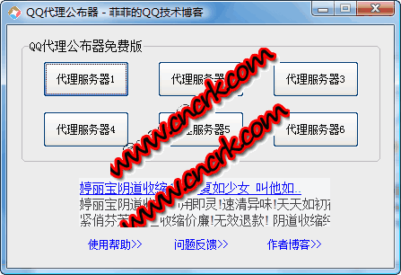 菲菲qq代理公布器是一款支持設(shè)置qq網(wǎng)吧代理,qq普通代理的一鍵代理,功能強(qiáng)大的ip代理軟件,增加兩組代理服務(wù)器,使用更加簡(jiǎn)單化,所有代理服務(wù)器只需一鍵點(diǎn)擊即可免費(fèi)使用,其他方面的一些改動(dòng)優(yōu)化